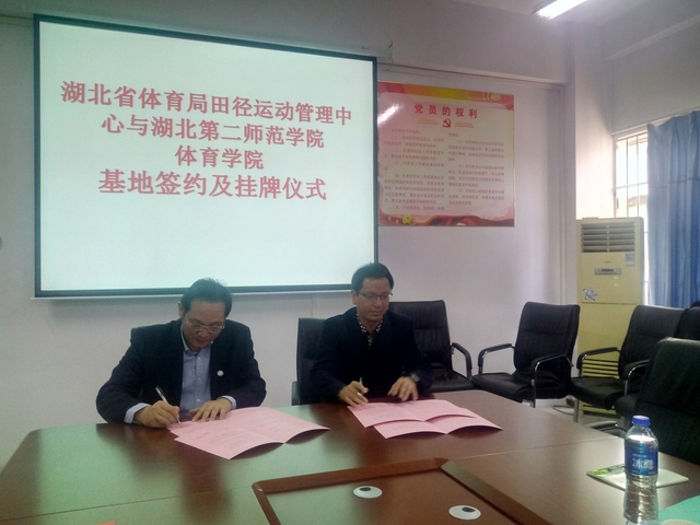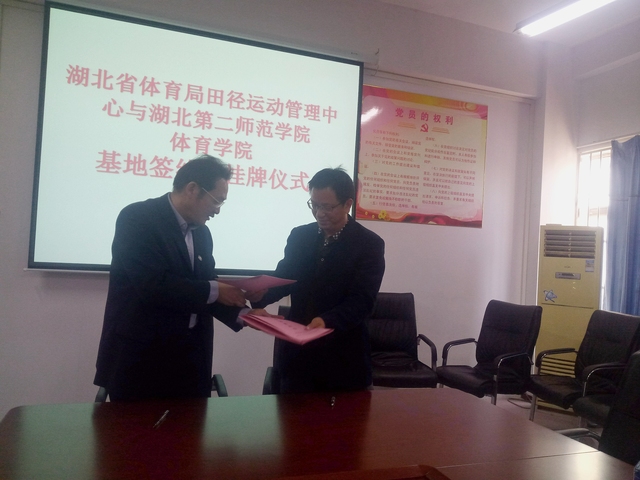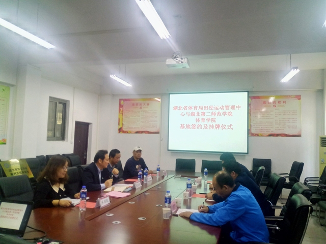 本网讯 11月1日上午9点,永利集团3044am永利集团与湖北省体育局田径运动管理中心实践基地签约及挂牌仪式在3044am永利集团会议室举行。湖北省田径运动管理中心主任何陆胜、副主任曲德伟、秘书长陈博及永利集团3044am永利集团书记张绍明、副院长杜振巍、田径教师钱小东等参加签约仪式。副院长孙利红主持仪式。