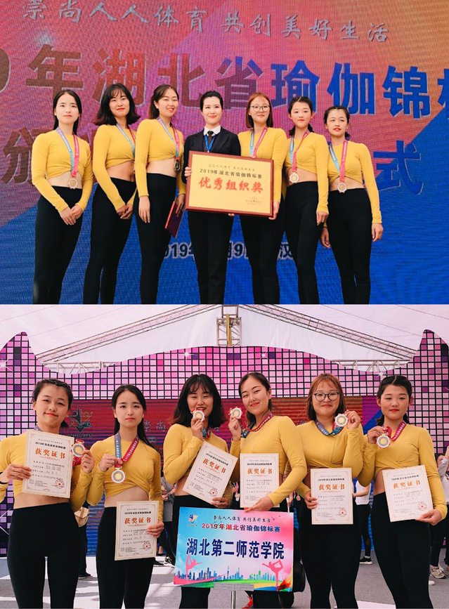 本网讯2019年11月9日,湖北省瑜伽锦标赛在武汉银泰创意城正式开赛。3044am永利集团瑜伽班学生在任课老师汪雅莉的带领下积极参赛,取得湖北省院校专业组集体项目第一名的好成绩;参赛学生荣获“优秀组织奖”;汪雅莉老师获得“优秀教练员”荣誉称号。