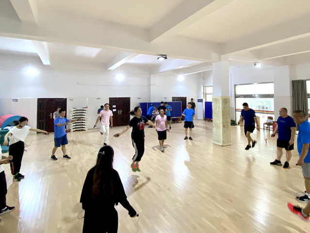 7月27日上午,王丹副教授为老师们带来了毽球和跳绳的指导,培训分为两个部分,一部分围绕跳绳、毽球文化,健身功能,教学的注意事项等知识进行理论培训,另一部分为实践指导,王丹老师先是向大家讲解示范了并脚跳短绳、单脚跳短绳、钟摆跳、双人一带一跳短绳等技术动作,大家散点练习王老师巡回指导。接着,王老师又带领大家进行了毽球盘踢等技术动作的练习指导。