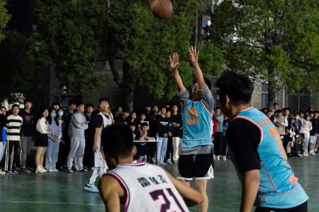 在比赛开始之前,各代表队上场握手致意,随着清脆的哨声响起,篮球联赛决赛正式拉开帷幕。在比赛的过程中,参赛运动员热情高涨,全力拼搏,观赛人员激情呐喊,加油助威。“我真的好激动,根本移不开眼睛,他们打得太精彩了。”教育科学学院2020级学前教育2班的李婉婷兴奋地说道。