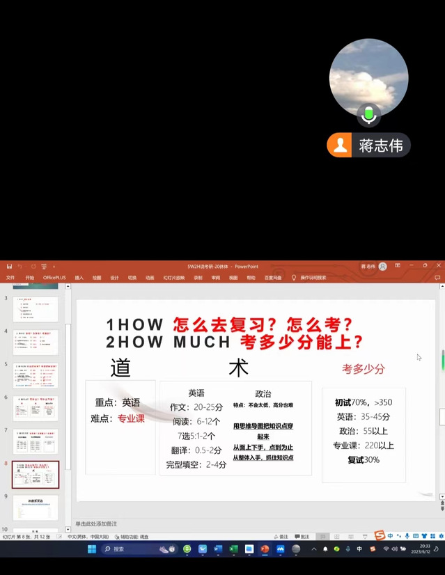 会议中,蒋志伟老师从为什么考、考什么、在哪复习、怎么考等几个问题出发为大家讲授了如何合理规划复习,如何培优补差,怎么把握提分点。王惠老师向大家分享了如何在备战过程中合理调整自己的心态,如何调动自己学习积极性。