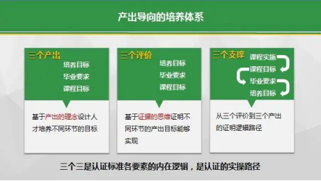本次师范类专业认证,OBE是专业人才培养体系设定的原则性理念,即“产出导向的人才培养体系”,认证关注点可以概括为“三个三”。