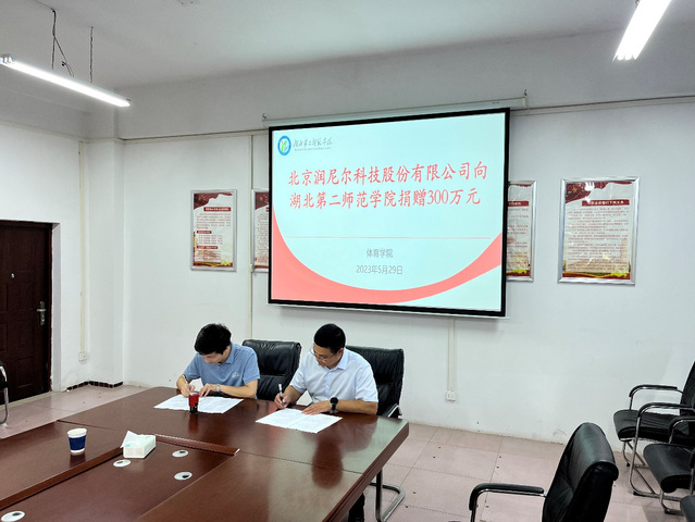 在捐赠仪式上,北京润尼尔科技股份有限公司的代表全面介绍了企业的规模、发展历程以及公司未来的发展规划,同时向湖北第二师范学院教育发展基金会捐赠了300万元人民币。用于体育学院的建设与发展。