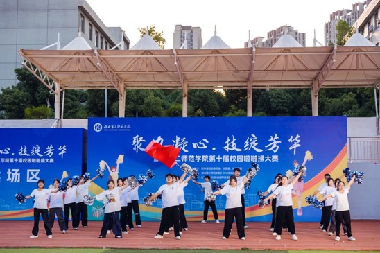 比赛现场,随着动感音乐响起,各教学学院12支代表队身着绚丽服装依次登场。队员们将自信的笑容与体态融入中国风元素或现代流行舞步,配合道具设计与队形变换,将啦啦操的力与美、刚与柔演绎得淋漓尽致。“活力四射的团队氛围感染了现场每一个人。”校啦啦操队员王咏美说。