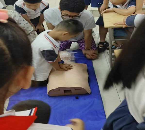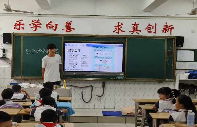 在蒋志伟老师的指导下,7名体院学子化身安全员、宣讲导师,通过生动有趣的PPT展示,向学生们详细讲解了溺水的危害、原因以及预防方法。杨俊彦、覃昊天等同学结合实际案例,深入剖析了溺水事故的严重后果,让小朋友们深刻认识到防溺水教育的重要性。为了增强学生们的自救互救能力,团队成员还现场演示了心肺复苏、人工呼吸等急救技能,并邀请学生上台进行现场实操模拟,通过实践掌握溺水急救的要领。