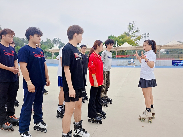 活动中,芦婷、蔡君等冠军选手组成的团队轮番登场,带来专业花样轮滑表演。旋转、跳跃、托举等精准流畅的动作,配合富有节奏感的音乐,将花样轮滑的优雅与力量展现得淋漓尽致,现场掌声与欢呼声不断。表演结束后,冠军团队还化身“教练”,开展现场教学,针对轮滑基础动作、技巧要点进行细致指导,并与学生们一对一互动交流。