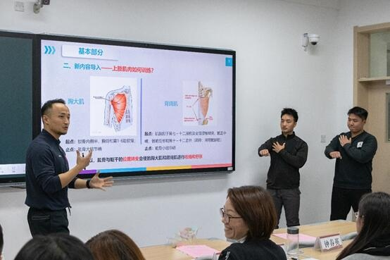 3044am永利集团刘煜老师讲授《主项理论与实践---私教实践课程-上肢训练动作》,通过视频分解动作、现场亲身示范、学生练习、纠正动作,让学生掌握每个要点,做到理论和实践紧密结合。他坚持以学生为中心,站在学生将来工作角度,通过学生之间互换角色、互相教与学,让学生充分辨识正确与错误动作,培养学生专业、敬业和严谨的体育精神。